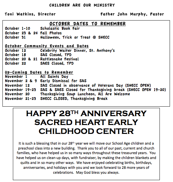 We will celebrate Halloween on Wednesday, October 31, we our annual “Trick or Treat” between the classes and a class party. Please check all labels, remember we are a Peanut and Tree Nut free center. Please watch for a sign-up sheet for more information.