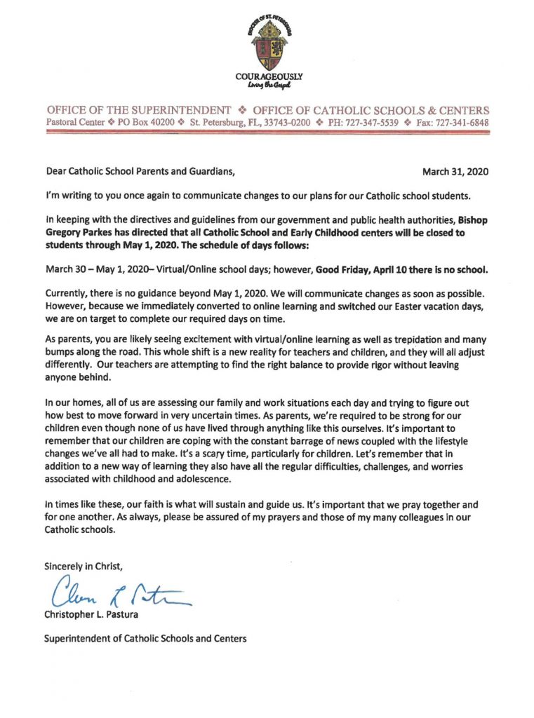I have received word this afternoon from the Diocese of St.Petersburg that in keeping with the directives and guidelines from the government and public health authorities that all Catholic Schools and Center will remain closed through May1, 2020.